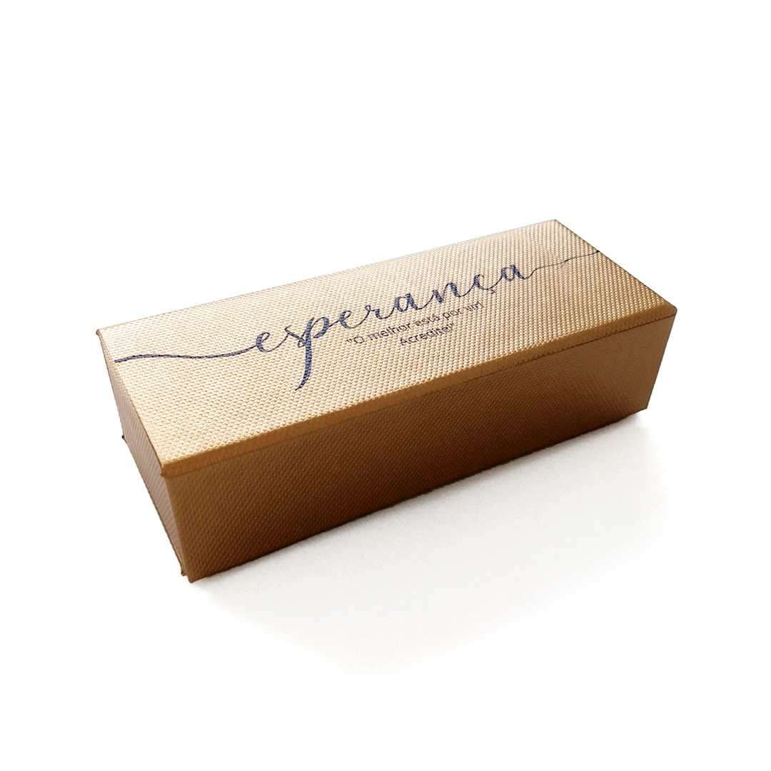 Caixa rígida dourada com letras a preto e com iman para fechar